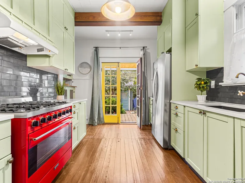 Located in the heart of San Antonio's treasured King William Historic District, 545 Wickes is a beautifully restored 1915 Craftsman cottage that blends classic charm with thoughtful, modern updates. Just steps from the Riverwalk, this home offers the perfect balance of history, culture, and urban convenience. From the curb, you'll notice its timeless lines, freshly painted exterior, and the gleam of a new standing seam metal roof. Inside, the warmth of the home welcomes you immediately - high ceilings, original architectural details, and a layout that feels both intimate and airy. The kitchen is a showstopper! A striking red SMEG Portofino gas range anchors the space, paired with a paneled Bosch dishwasher that blends seamlessly into custom cabinetry. Whether you're a home chef or a collector of beautiful spaces, this kitchen delivers. Both bedrooms are generously sized, and the two full...