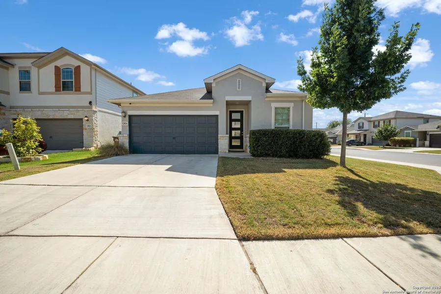 Beautiful one-story 3-bedroom, 2-bathroom home located in Prescott Oaks, featuring an open floor plan with separate living and dining rooms and high ceilings throughout. The large kitchen offers a spacious island, stainless steel appliances, and gas cooking perfect for everyday living and entertaining. Built-in workstation provides the ideal space for studying or working from home. The primary suite includes an ensuite bath with dual vanities, a stand-in shower, and a garden tub, plus a large closet. All bedrooms have ceiling fans. Enjoy a covered patio and fenced backyard, perfect for relaxing or hosting gatherings. Quick drive to 1604 and conveniently near shopping and restaurants. Property includes solar panels with a backup battery to save on energy costs!