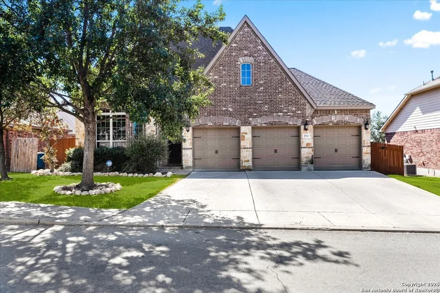 Impressive 5 Bedroom, 4 Bathroom home with a 3 car garage, exceptional upgrades, and inviting outdoor living spaces. Every detail of this thoughtfully designed home showcases comfort, style, and functionality throughout. Step outside to your private oasis featuring a covered patio, recently extended expansive patio, and a custom deck with bar seating - perfect for entertaining or relaxing year-round. Inside, you'll find rich wood flooring in the entry, study (optional 5th bedroom), dining room, and spacious family room. The open-concept gourmet island kitchen is a chef's dream with double ovens, gas cooktop, walk-in pantry, decorative wooden vent hood, and breakfast room that flows seamlessly into a family room with coffered ceiling and cozy fireplace. The primary suite and a secondary bedroom are conveniently located on the main floor. The luxurious primary retreat features bay windows, granite double vanity, oversized shower, garden tub, and an enormous walk-in closet. Upstairs, enjoy a large game room and three spacious bedrooms, including one with an ensuite bathroom, double vanities, and walk-in closet - ideal for a secondary primary suite or guest quarters. Additional features include soaring and vaulted ceilings, upgraded ceiling fans and lighting, a generous laundry room with cabinetry, and NO city taxes! Located in a vibrant community with Indian Springs Elementary (prestigious Comal ISD and zoned to Pieper High School) in the neighborhood and access to resort-style amenities - pool, park, pavilion, sports court, and more! Don't miss this incredible opportunity - luxury, space, and lifestyle all in one! Welcome home!