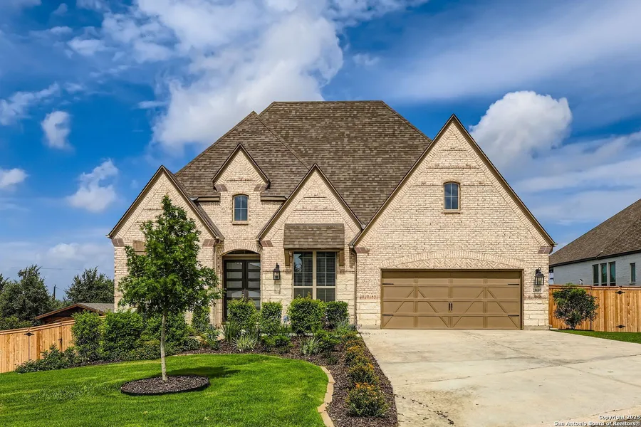 A wide double door entrance sets the tone for this single story home in the Front Gate neighborhood, leading into a thoughtfully designed interior where clean lines and quality finishes take center stage. Wood flooring stretches across the main living spaces, grounding the open floorplan with warmth and texture. The kitchen sits as a functional focal point, with a quartz-topped island, stainless steel appliances, and a six-burner gas cooktop that makes daily meals and weekend hosting equally effortless. Just off the kitchen, a casual conversation area with a fireplace adds an inviting space to unwind, separate from the larger family room. Beyond the main living areas, a dedicated study provides a private work-from-home retreat, while a media room delivers a space tailored for movie nights or game-day gatherings. The primary suite is generous in scale and layout, offering privacy and quiet when you need to get away. Three additional bedrooms and two more bathrooms allow room for family and guests without crowding the floorplan. Outside, the backyard unfolds as an extension of the living space. A covered patio with fireplace meets an extended deck with hot tub/spool, framed by a grassy lawn and a lit gazebo set among blooming planters. An electric awning offers adjustable shade, while climate-controlled storage beneath the deck adds utility without compromising aesthetics. The three-car garage includes a speckled floor finish and extra storage space. The home is powered in part by a 9 kW solar system and is equipped with a Generac 24 kW whole-house generator, delivering both efficiency and long-term value.
