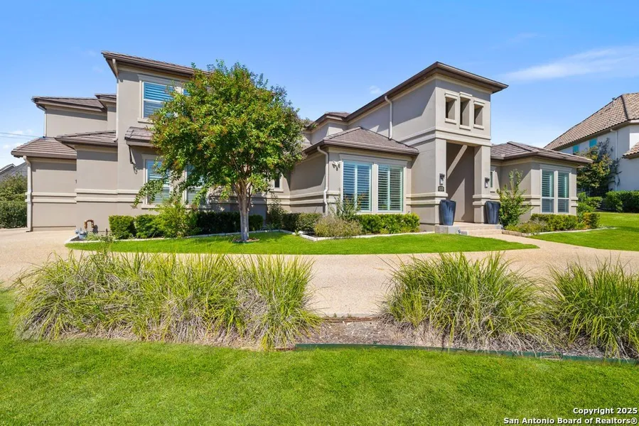 Experience elevated living in The Dominion. Tucked at the end of a quiet cul-de-sac, this stunning Mediterranean contemporary masterpiece sits on a half-acre lot and was built by highly respected local builder McNair Custom Homes, known for exceptional craftsmanship and timeless design. Spanning 4,905 square feet, the home offers 6 bedrooms, 5 full baths, and 2 half baths, and lives like a single story with three bedrooms and a spacious game room downstairs, and only three bedrooms and a loft upstairs. Designed for comfort and style, five of the six bedrooms are private en suites, and the interior showcases rich wood and tile flooring, high ceilings, and an open, light-filled layout ideal for entertaining. Outside, enjoy resort-style living with a Keith Zars Pool and adjoining spa, an outdoor kitchen, and a covered living area perfect for gatherings. Set within the prestigious, guard-gated community of The Dominion, this home exemplifies sophisticated Hill Country living-offering elegance, functionality, and a peaceful setting in one of San Antonio's most sought-after neighborhoods.