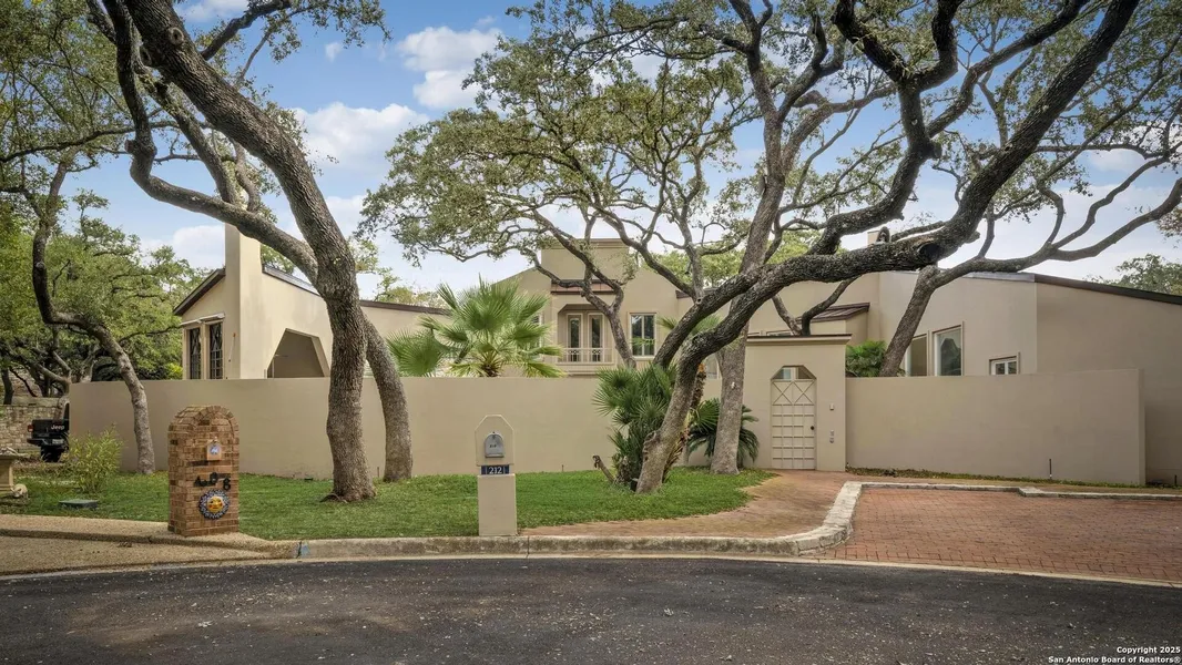 Spectacular custom built home. Stucco exterior, metal roof, soft contemporary home. Open floorplan. Stainless steel double fireplace. Walk behind wet bar with wine closet. Primary bedroom has two oversized closets and one large shoe closet. Room with Sauna. Built in Coyote Grill. Breakfast and kitchen overlook pool and outdoor living. Majestic oak trees. Walled in private residence. Pool and spa is heated. Dramatic floor to ceiling windows. Honed travertine in primary bath. All updated floors, paint, landscaping, bathrooms. appliances and plumbing hardware. This one will not last long.