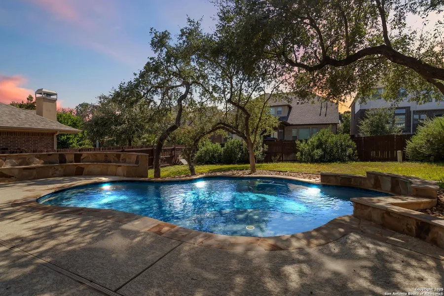 Exquisite Home with Pool, Theater, and Upgrades in Terra Bella - Reagan HS! Welcome to this stunning 5 bedroom, 4.5 bath home located in the highly sought-after Terra Bella community, feeding into Reagan High School. The spacious open-concept floor plan welcomes you with high ceilings, abundant natural light, and a seamless flow perfect for everyday living and entertaining. The living room features a stone fireplace, custom alcoves, and built-in media cabinetry, while the adjacent entryway showcases iron stair railings, tile floors, and a designated home office or study. You'll be captivated by the oversized kitchen, enhanced by pendant lighting, surrounded by granite countertops, generous cabinetry and drawers, and a gas cooktop with built-in oven and a breakfast area! The extra large primary suite offers a tranquil retreat with tons of natural lighting and the primary bathroom features a separate garden tub and shower, double vanity, and a large walk-in closet. Entertain or unwind in the oversized theater room, complete with Epson sound and projection system. The home also has a separate flex room to use as a home gym, playroom or gameroom. The large backyard is truly an oasis, complete with a covered patio with drop-down shades, a sparkling pool, and several dining and lounging areas surrounded by mature trees offering plenty of shade. Additional highlights include a brand-new roof, new dishwasher, and a fully equipped theater system with projector and surround sound. The home features tile and hardwood flooring throughout-carpet in the media room only, offering both style and easy maintenance. Situated in a gated community with controlled access, you'll enjoy added peace of mind. Conveniently located just minutes from shopping, dining, and major highways, this home offers the perfect blend of luxury and accessibility. Don't miss your chance to own this move-in-ready home in the highly desirable Terra Bella community-schedule your private showing today!