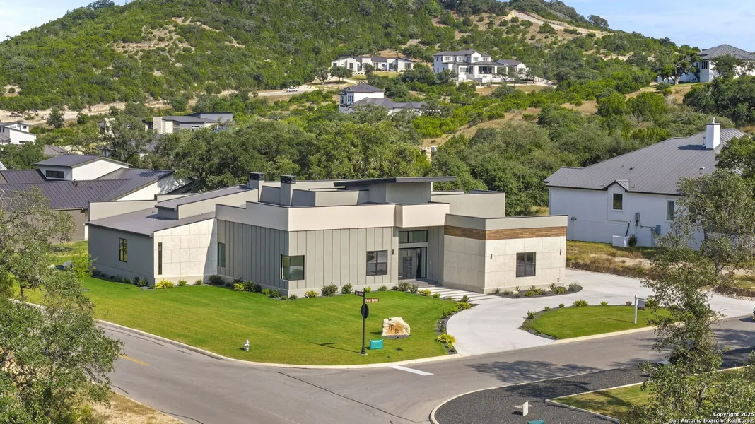 A statement of modern architecture and refined Hill Country living, this custom single-story residence in The Canyons at Scenic Loop is constructed with 2x6 exterior framing, enhanced insulation, and single-slope standing seam metal roofing for superior efficiency, longevity, and clean contemporary lines. Offering 3,719 sq. ft. of intentional design, the home features gallery-height ceilings, expansive walls of glass, and seamless indoor-outdoor connection. The open living space is anchored by a striking feature wall with a linear fireplace, flowing into a chef's kitchen with European-inspired cabinetry, a waterfall black granite island, 48" professional gas range with pot-filler, double ovens, and a hidden walk-in pantry. The owner's retreat evokes a spa-like sanctuary with a sculptural soaking tub, oversized glass shower, and warm natural textures. Outdoor living becomes an everyday ex...