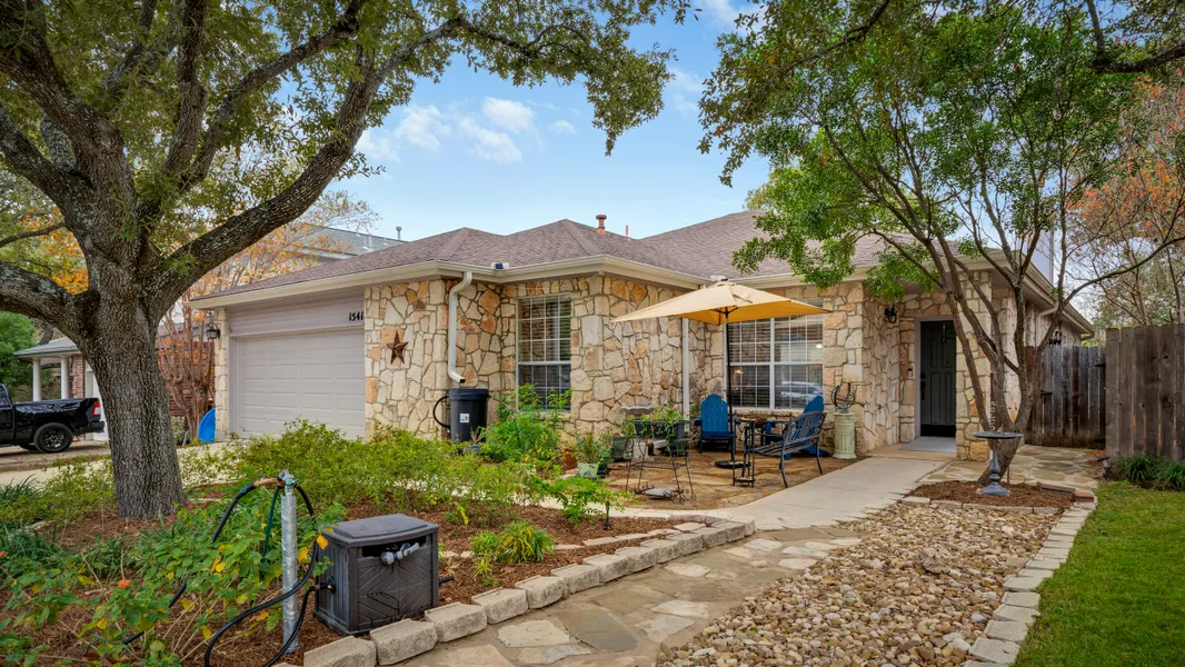 Welcome to this beautifully maintained single-story stone home in a desirable community, offering exceptional indoor/outdoor living and thoughtful updates throughout. A charming front patio welcomes you inside to an open, light-filled floor plan featuring rich wood flooring, a stone fireplace, and generous living and dining spaces perfect for entertaining. The expansive island kitchen is a standout, complete with granite countertops, custom cabinetry, double ovens, gas cooking, pendant lighting, and abundant storage. A dedicated study sits at the front of the home with built-ins and great natural light, ideal for work or hobbies. The spacious family room at the rear of the home features wrap-around windows that capture peaceful views of the garden, creating a warm and inviting second living area. The primary suite offers comfort and privacy with an updated walk-in shower, dual vessel sinks, and abundant storage. Secondary bedrooms are well-sized, and the home has excellent flow for everyday living. Step outside to beautifully landscaped grounds with flagstone walkways, mature trees, garden beds, and multiple seating areas, an oasis for morning coffee, outdoor dining, or simply enjoying the tranquil surroundings. A raised deck with railing provides easy outdoor access from the kitchen and living space. This meticulously cared-for home blends charm, functionality, and privacy, all in a convenient San Antonio location near shopping, dining, and major thoroughfares. A wonderful opportunity for buyers seeking a move-in-ready single-story home.