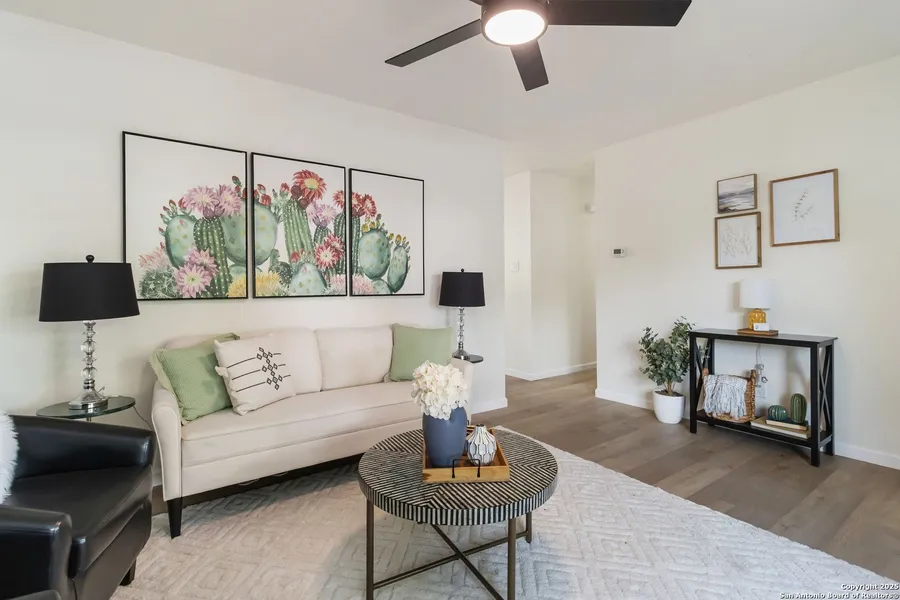 "Welcome home! This stunningly remodeled property blends style and comfort, making it the perfect place to feel at home. Fall in love with the gleaming quartz countertops, elegant marble backsplash, brand-new kitchen cabinetry, stainless appliances, and custom-tiled showers. This home has been designed to impress family and guests alike. The solarium, a versatile extra 200 sq. ft. space, is a true highlight offering the best of indoor-outdoor living year-round. Whether it becomes your home office, yoga studio, playroom, or relaxation nook, this bright, sun-filled room offers endless possibilities to fit your lifestyle. Nestled in a peaceful, family-friendly neighborhood, with quick access to highways 151, 90, and 410, this home is ideally located for an easy commute. Downtown and Lackland AFB are just minutes away, and local shops and conveniences are right around the corner, perfect for...