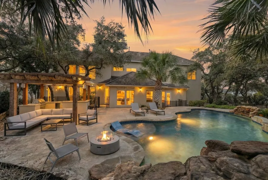 Phenomenal location! Experience hilltop living with majestic views in the desirable gated Village in the Hills neighborhood. This custom two-story home offers space for all with 5 bedrooms and 4.5 bathrooms and true resort style grounds. High ceilings and expansive windows frame the home with natural light, creating a sense of openness and scale throughout. The kitchen suits cooking and entertaining alike, boasting an expansive L shaped center island, stainless steel appliances, extensive cabinetry, walk in pantry, all while overlooking the main living area, creating a seamless central gathering area. The primary suite provides a private retreat with architectural ceiling details, direct access to the outdoors, two walk-in closets, and a generously sized bath with soaking tub and separate shower. Secondary bedrooms are well appointed with en-suite bathrooms and walk-in closets. Additional spaces include a office, formal living room, and a game room with custom built-ins. Outdoors, the lushly landscaped grounds are designed for both relaxation and entertaining. The resort-style pool features multiple water elements, a grotto, and sun shelf, surrounded by mature landscaping creating utmost privacy. Multiple outdoor living areas include a covered kitchen with grill, sink, and prep space, complemented by additional pergola seating. Oversized two car garage offers ample storage opportunities and built-in racks. Located minutes from Stone Oak Park, shopping, restaurants, medical, San Antonio Airport, and Downtown San Antonio.