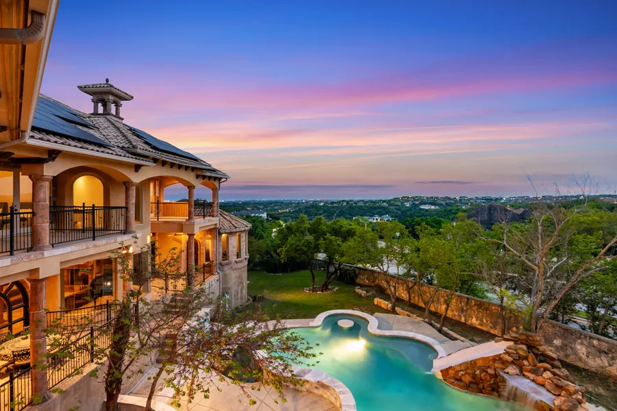 Set behind the gates of one of San Antonio's most exclusive enclaves, this refined Tuscan inspired estate blends European architecture with resort caliber living. Framed by mature oak trees and thoughtfully landscaped grounds, the residence delivers a sense of arrival defined by proportion, craftsmanship, and timeless design. Inside, soaring ceilings, graceful archways, and curated architectural detailing create a seamless flow throughout the home. A private elevator connects all levels, offering both convenience and long term functionality. Natural light fills the interiors, enhancing the scale and warmth of each living space. At the center of the home, the chef's kitchen is designed for both everyday living and elevated entertaining, featuring commercial grade appliances, custom cabinetry, and effortless connection to multiple terraces and Juliet balconies. Interior spaces transition naturally outdoors, creating an ideal setting for dining, hosting, or quiet retreat. Designed for entertainment and comfort, the home includes a private theater, observatory style library, and well appointed bedroom suites offering privacy and flexibility. Discreet solar integration and advanced home systems support modern living while preserving the integrity of the architecture. Outdoors, over 2,000 square feet of terrace and entertaining space surrounds a Keith Zars heated pool and spa complete with waterslide and multiple gathering areas anchored by dual outdoor fireplaces. The result is a private retreat that feels both expansive and intimate. A stately three car garage completes the property, delivering functionality without compromising design. This is a residence defined by craftsmanship, setting, and thoughtful execution, offering a rare opportunity to experience elevated living within a truly distinguished estate environment.