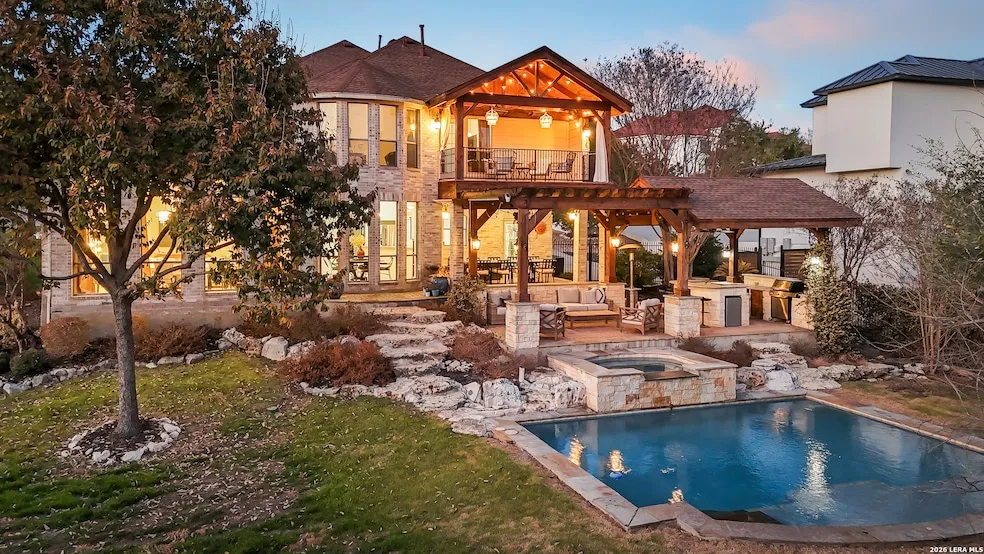Welcome to 1410 Grey Flint Cove, perfectly situated on a sprawling 1.09-acre cul-de-sac lot within a prestigious 24/7 guard-gated community. This stunning custom two-story brick home offers 4 spacious bedrooms, 3 full baths, and a versatile flex space that can easily serve as a 5th bedroom, playroom, or additional private study. From the moment you arrive, you'll be impressed by the exceptional curb appeal featuring mature palms, professional landscape lighting, and a charming stone walkway leading to a grand entrance. Inside, soaring ceilings, rich hardwood floors, and abundant natural light create a warm yet elegant atmosphere. The expansive living room showcases a dramatic floor-to-ceiling stone fireplace, oversized windows, and seamless flow into the formal dining area highlighted by statement chandeliers. The chef's kitchen opens beautifully to the main living areas, offering an ideal layout for both everyday living and entertaining. The primary suite is generously sized with vaulted ceilings and a private sitting area, creating a true retreat. The luxurious en-suite bath features dual granite vanities, abundant cabinetry, a soaking tub, and a walk-in shower. A dedicated office with modern lighting makes working from home both comfortable and functional. Architectural details including arched windows, crown molding, and designer fixtures add character and timeless charm throughout. Step outside to your private backyard oasis complete with a sparkling in-ground pool, expansive covered patio with wood beam ceilings, outdoor kitchen area, and multiple seating spaces designed for year-round entertaining. An elevated balcony provides peaceful views of the beautifully landscaped grounds, while mature trees offer added privacy and shade. Additional outdoor highlights include a trampoline area and thoughtfully terraced landscaping. This exceptional residence offers timeless design, unmatched outdoor living, and all the modern amenities to support a luxurious lifestyle. Close proximity to loop 1604 and near retail shops, restaurants and entertainment.