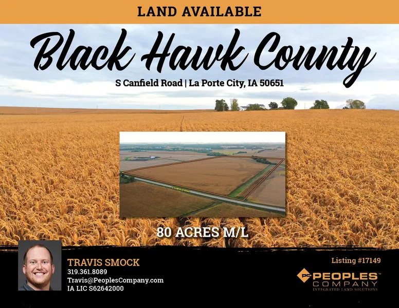 A nice 80-acre m/l farm available between Gilbertville & La Porte City, Iowa! This Black Hawk County farmland tract sits high along paved S Canfield Road and offers something for everyone with a high percentage of quality tillable land, a small section of timber along a creek, and the potential for a building spot with excellent views. There are 73.98 FSA Cropland Acres carrying a CSR2 of 77 and an NHEL (Non-Highly Erodable Land) designation. Tile has been added to the farm over the years. Furthermore, 2.98 acres m/l in the northwest corner of the farm consists of timber and a small stream creating recreational opportunities. The high point in the southeast corner bodes well for natural farmland drainage in addition to creating an excellent place to build a home or farmstead in the future with faraway sunset views. The paved S Canfield Road creates easy access to Highway 20 and Interstat...