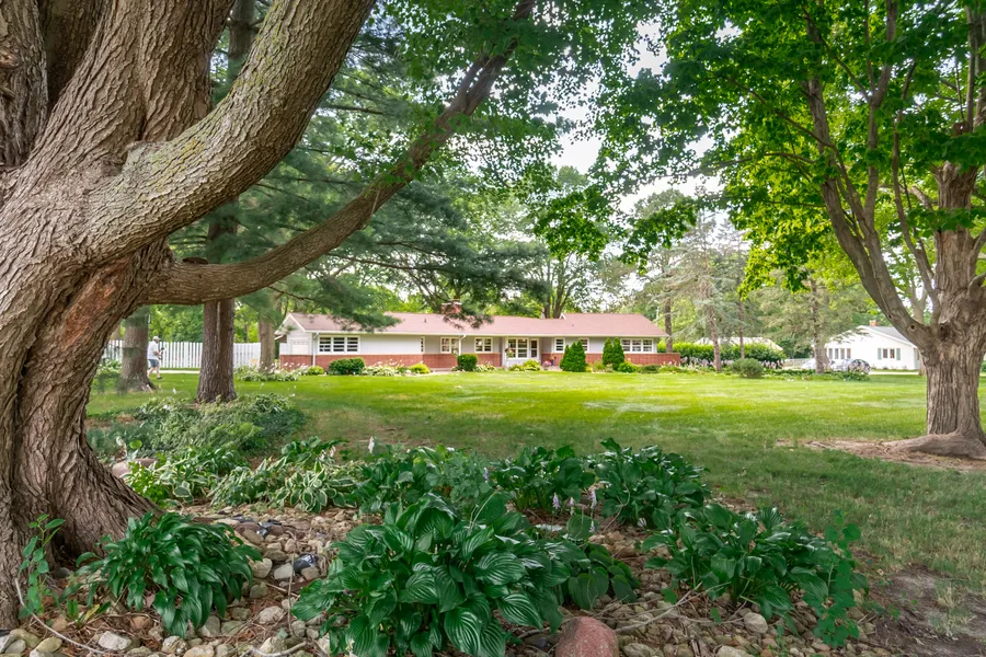 In-town acreage! Built in 1955 for a doctor, this unique floor plan with the living room at the back of the house, gives you restful views of the treed rear yard, children's play area, fire pit and shed. The living room and dining room each have solid wood beams on the vaulted ceiling & the rooms are divided by a 2 sided wood burning fireplace. Check out the kitchen with cupboards and countertops that seem to go on forever. If you like storage, this house has large closets, hidden storage in the split level bedrooms, lower level family room and attached garage. All measurements are approx.
