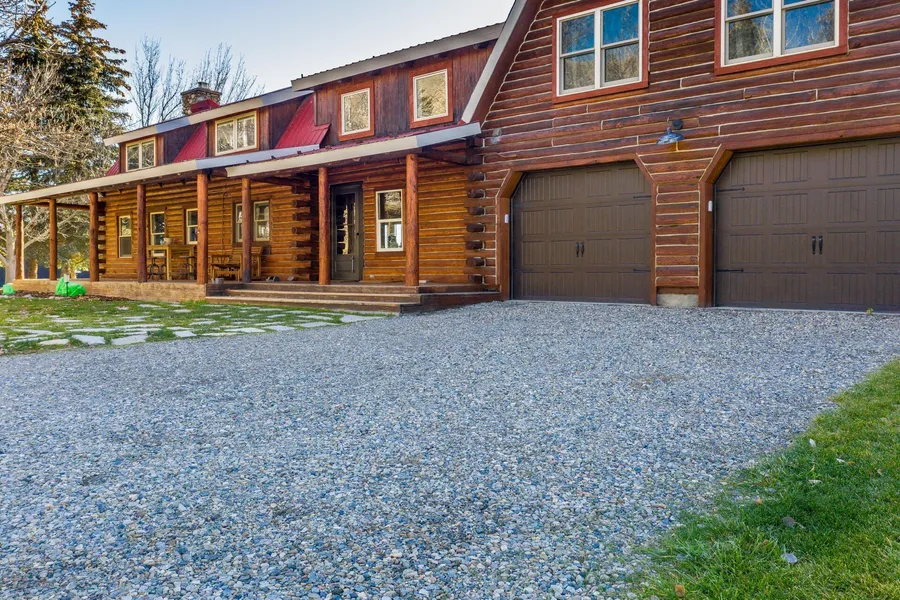 Charming, serene, and private, this 3BD/2.5BA log home rests on 5+ acres with wide-open vistas and a seasonal canal along the west boundary. The home offers an inviting blend of rustic elegance and modern comfort across two levels, where warm log craftsmanship and radiant-heated concrete floors create an elevated yet cozy atmosphere. The property features a 1,500 sq. ft. shop
