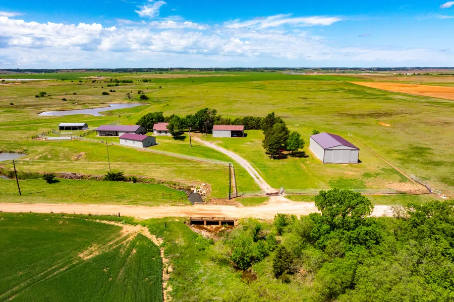 160 Acre Agricultural Paradise- Ready for your vision! This stunning 160 acre property features fertile, productive cropland and everything you need to build your dream homestead. Enjoy 3 stock tanks, fed by a natural spring, corrals, cattle guard, and a chicken coop for your livestock needs. This partially finished barndominium is ready for your personal touch, while the 40X80 shop AND a fully insulated 24X48 3 bay shop (with its own heat and air system) provide plenty of workspace. The barndominium includes a water softener as well as a generator. Additional features include a separate shop equipped with electricity, two storm shelters both inground, and an in-ground pool with a brand new liner, perfect for relaxing after a day's work. Property is fenced all around with sturdy fencing, as well as a cattle guard at the front entrance. Don't miss this rare opportunity to own this agricultural retreat with endless potential. NO RESTRICTIONS- Seller is motivated, bring us an offer!