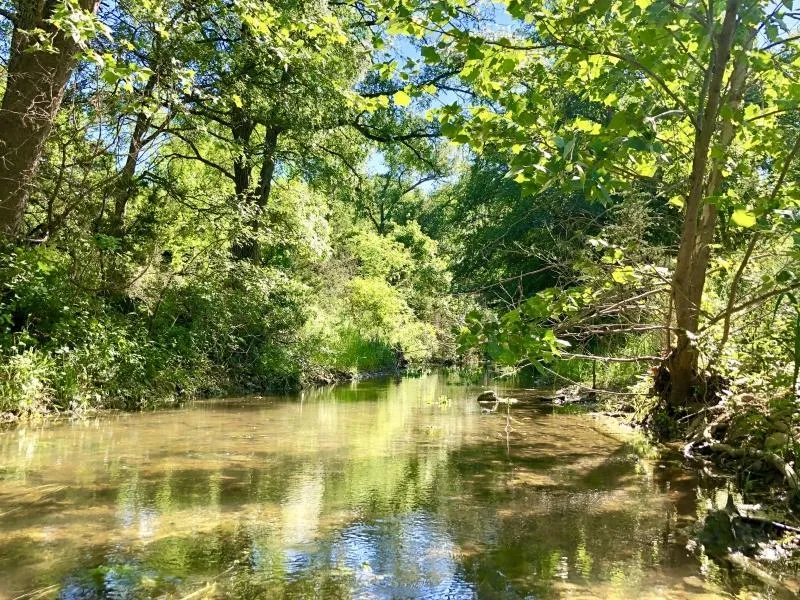 Towering sycamore, native pecan, elm and oak trees line the banks of Flat Creek for over 1,700 through