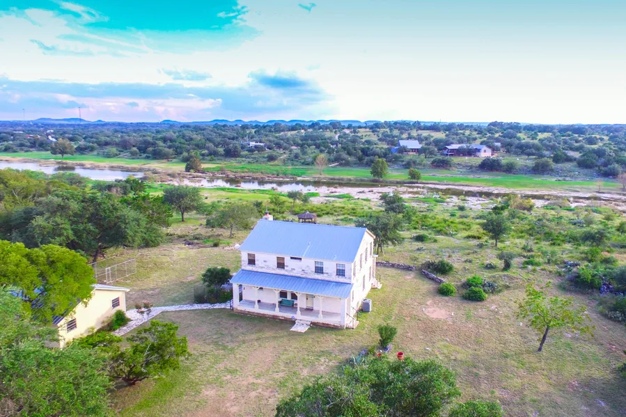 This live water Texas Hill County property sits on a private 5.5-acres of gently sloping hill in the heart of vineyard country in Johnson City with 159ft of waterfront on the Pedernales River. An updated Craftsman style 1,889sf 3BR/2BTH Home has center stage with a covered front porch and uninterrupted nature views to the North, and a covered back porch providing spectacular views of the river to the South. The home also features an airy floorplan with high ceilings, a main level master with a claw-foot tub in the master bath, and an extra-large kitchen that opens up to the large main living room. The propertys exterior features beautifully manicured landscaping creating a park-like setting, and a picturesque stone lined path passing by a charming gazebo perfect for sunset watching and taking in the native plant life and peaceful surroundings. An easy walk down the path leads to the Pede...