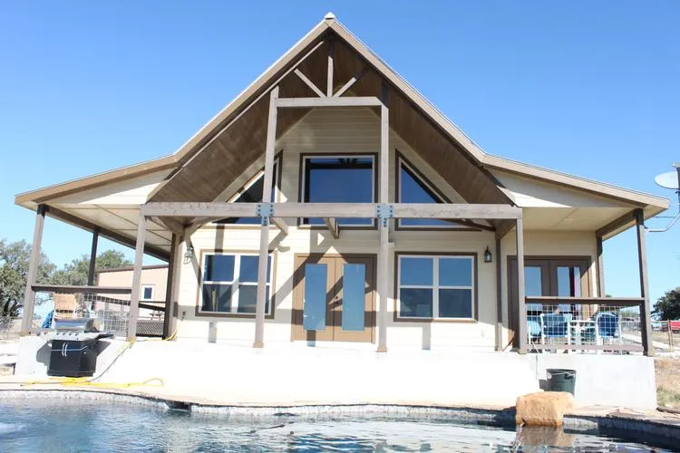 THIS IS A BEAUTIFUL A FRAME HOUSE ( WITH POOL ) SITTING ON A MAJESTIC HILL COUNTRY PROPERTY. GREAT 3 CAR GARAGE WITH TWO BEDROOMS AND A BATH. THE VIEWS ARE SPECTACULAR AND YOU HAVE END OF THE ROAD PRIVACY. GRANITE COUNTERTOPS, WOOD FLOORS, FIREPLACE AND 58+/- ACRES TO ENJOY WITH YOUR FAMILY AND FRIENDS. FULLY FENCED AND HAS A WILDLIFE EXEMPTION. ADJOINING ACREAGE AVAILABLE.