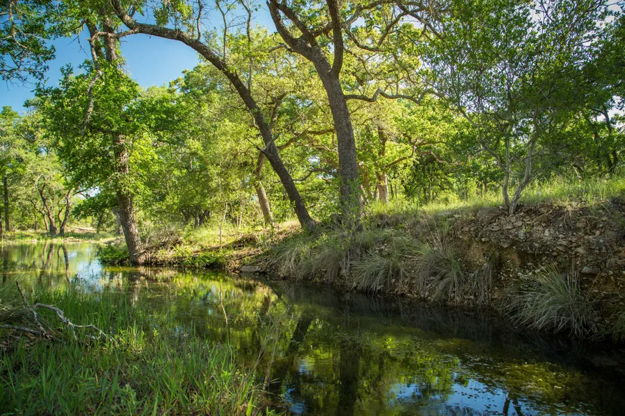 Water - The ranch is loaded with unique water features, springs & seeps. The East grotto is a spring fed 5'-6' drop off that feeds the middle lake. The West grotto has two active springs and has been dammed creating a nice pool of water. From this point multiple branches form the Elm Creek lined stream that eventually leads to the middle lake estimated to be 2 acres in size. An additional section of Elm Creek flows over rock bottom and merges with an additional drainage where the larger lake estimated to be 3+ acres forms.