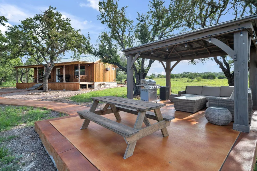 Improvements: Situated amongst manicured oak trees is a true Hill Country casita. It contains one large bedroom and stylish bathroom and an open concept living and dining area with full kitchen. Tons of windows let natural light in while the covered patios and wood blinds shade the interior. Cedar board and batten exterior with stone skirting and metal roof blend right into the natural surroundings. Stained and sealed concrete walkways lead to large open as well as pavilion covered patios creating several locations to relax, cook, dine, and converse. All of this is adjacent to an unbelievable homesite surrounded by massive live oaks, overlooking a large pond and 10 acre terraced field. A large stone firepit, full RV hookups, gravel and granite driveway, perimeter fencing, gated entry, 30gpm water well and traditional septic system round out the improvements, making this little ranch ready to be enjoyed today. Approximately 650 of paved county road frontage.