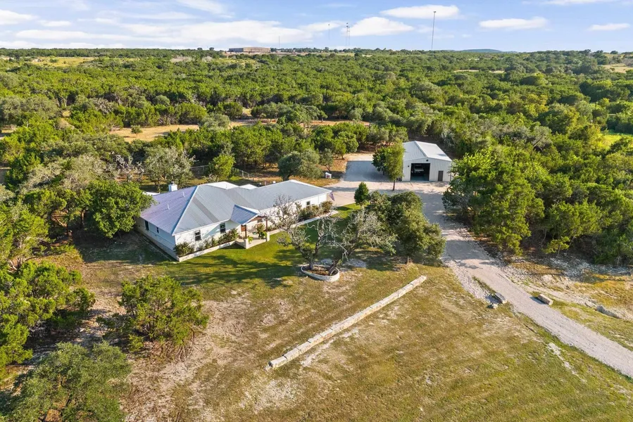 Luxury Hill Country Retreat on 11 Private Acres. 3 bedrooms plus a home office. Behind a private gate and winding drive, this custom 2,909 sqft Hill Country retreat offers refined living just minutes from Burnet. Elevated for scenic views and ultimate privacy, the home blends classic Texas charm with modern design. Inside, cathedral ceilings and expansive windows fill the open-concept living area with natural light. A dramatic corner floor-to-ceiling stone surround fireplace anchors the space, while the gourmet kitchen features gleaming granite counters, stainless appliances, custom cabinetry, deep storage drawers, and a large walk-in pantry ideal for small appliances and prep. The thoughtful layout includes a dedicated home office and a separate flex space perfect as a second office or mudroom. The private owner's suite offers a spa-like bath with a walk-in shower, soaking tub, and dual granite vanities. A split-bedroom design ensures privacy for guests. Outside, an oversized covered patio shaded by mature trees invites quiet mornings and sunset entertaining perfect for summer barbecues. A low-profile fence offers security for pets without blocking views. Additional features include a poured-concrete walkway, 2 car garage attached to house and Shop with 1/2 bath is detached, ideal for hobbies or storage ~ Wildlife exemption keeps taxes low ~ Sale includes adjoining 5-acre raw land (separate legal lot) for expanded privacy, future build, or investment. Total of 11 acres, must be sold together