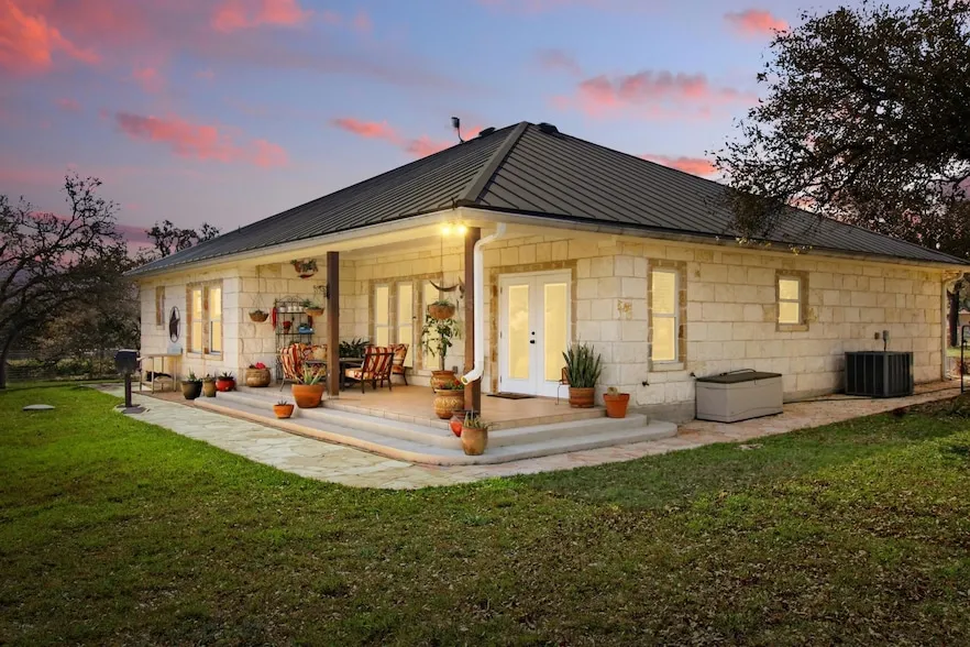 Stunning, architecturally designed, custom rock home in the acclaimed Cielo Springs gated subdivision just outside of Blanco, Texas! This beauty offers four bedrooms, two bathrooms, formal dining plus breakfast area, and a covered back porch, all on 2+ sprawling acres! The floorplan flows well with excellent natural light. Enter the foyer flanked by the formal dining on the left and the fourth bedroom or dedicated office on the right. Proceed to the voluminous living with large windows. The galley kitchen boasts granite countertops and recent 2024 SS appliances, along with a breakfast area. The hallway leads to the ancillary bedrooms and hall bathroom and then to the primary ensuite bedroom and bathroom. This large suite offers great space and views overlooking the back yard. The ensuite bathroom has a dual vanity, separate tub and shower, water closet, and walk-in closet. The two-car attached garage also has good storage. Outside you will find 2+ acres sprawling with over 50 oak trees. The covered back porch is the perfect place on a cool Spring evening. Rock sidewalk wraps the home providing ease of access. Conveniently located just 30 minutes from the 1604 Loop and San Antonio. This home is the perfect place to be; country living with the closeness of major cities and local towns. Check out this beauty today!!