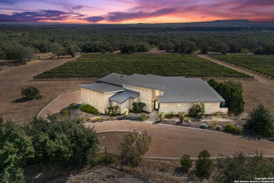 A rare opportunity awaits! This 12 acre, end of the road Hill Country retreat w/views for miles & its own award winning mature vineyard is now on the market. Energy efficient 3100 square foot single level home w/spray foam insulation, metal roof, heat pump HVAC system, well and rain harvest tanks, tankless water heater, Anderson windows and GE monogram appliances is an open floorplan w/wood & tile floors throughout. A split bedroom layout. Master bedroom offers a cathedral ceiling & private bath w/large soaking tub & walk-in shower. Two ensuite secondary bedrooms w/full bath & 4th bedroom is adjacent to the hall bath. Open kitchen/dining area w/walk-in pantry plus a separate wine room w/250 bottle storage. The beach entry pool w/spa tub & 30' wide outdoor living space features a built-in grill, frig, fireplace & retractable shades - all overlooking the vineyards. There is also a firepit ...