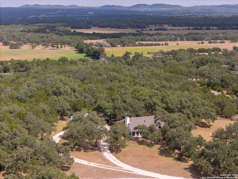 Rare opportunity to own a beautiful Hill Country home on the desirable northwest side of Cox Road, backing up to a large private ranch for added privacy & scenic views. Surrounded by majestic oak trees & excellent street appeal, this property is just minutes from the Blanco River, downtown Blanco, Blanco State Park, & offers an easy commute to both Austin & San Antonio. The home features a detached outbuilding with a workshop & covered parking, a spacious pavilion perfect for BBQs & gatherings, a fenced & very private backyard, plus a large covered back porch ideal for relaxing or entertaining. Inside, you'll find a well-designed layout with a large family room & fireplace, separate dining area, & a spacious island kitchen. The downstairs owner's retreat includes a private bath with a separate tub & shower, a walk-in closet, & a flex room/study with exterior access-perfect for a home office or gym. Upstairs offers two additional bedrooms with a Jack & Jill bath. This spectacular Hill Country gem combines comfort, privacy, and convenience-and it won't last long!