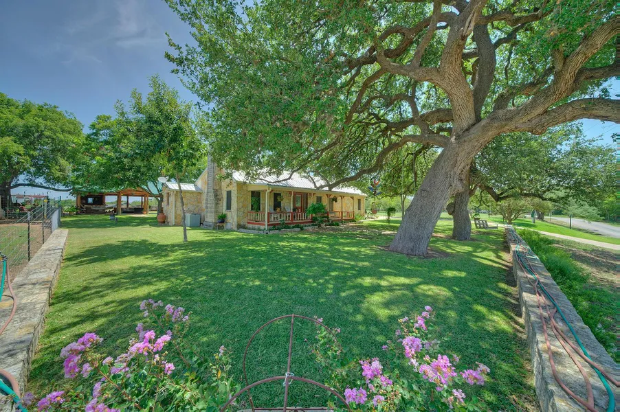 This gorgeous home sits on approximately 6.79 acres with giant heritage oaks and open pasture that would be excellent for horses or possibly a vineyard. The land is currently under agricultural exemption with bees/honey production. The home is serviced by Blanco water/wastewater but there is also a great producing water well that could be used for irrigation or livestock etc. The pasture is game proof high fenced and there are working pens. There is a really nice pole barn (40x60) to store equipment as well as a storage building, greenhouse, dog kennels, and chicken coup. Still standing is an old historic wooden barn and goat pens from the old ranch days that would be fun to restore.