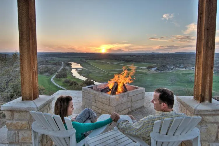 10 x 10 Pergola set on a 14 x 22 flagstone patio with fire pit overlooking the entire ranch