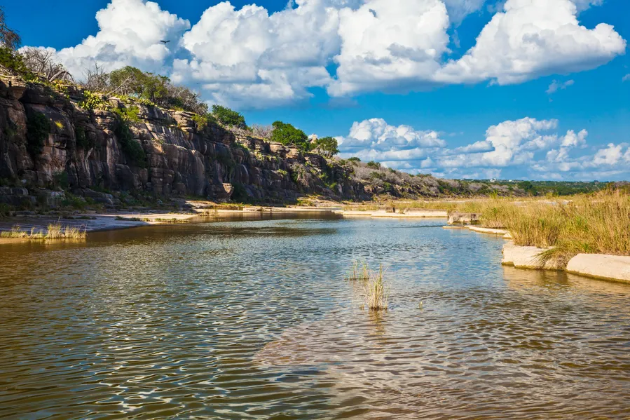 WATER: The clear-flowing Pedernales River forms the northern boundary of the ranch for almost 700. The rock-bottom frontage consists of riffles, shallow holes and minor falls, and is extra kid-safe while still offering floating, wading and fly fishing. A scenic limestone bluff serves as the backdrop on the opposite shore.