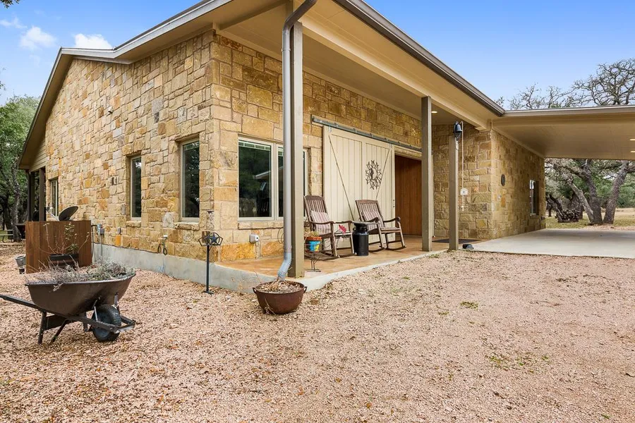 Stunning and extremely well kept ranch home on 25 beautifully wooded acres in Johnson City's nicest gated community. This 3 bedroom 2.5 bath rock home is absolutely breath taking. Its unique "dog run" style is very impressive. The 25 acres is nicely manicured and also offers a nice metal barn workshop with covered awning attached. Huge walk in closet in master. Large kitchen with granite counters and walk in pantry. Very unique large rock fireplace with built in entertainment center in living room. Stained concrete floors throughout. Very nice large back patio and fire pit area makes a peaceful place to enjoy outdoor entertainment. Great place for entertaining guest. This amazing property is a must see!