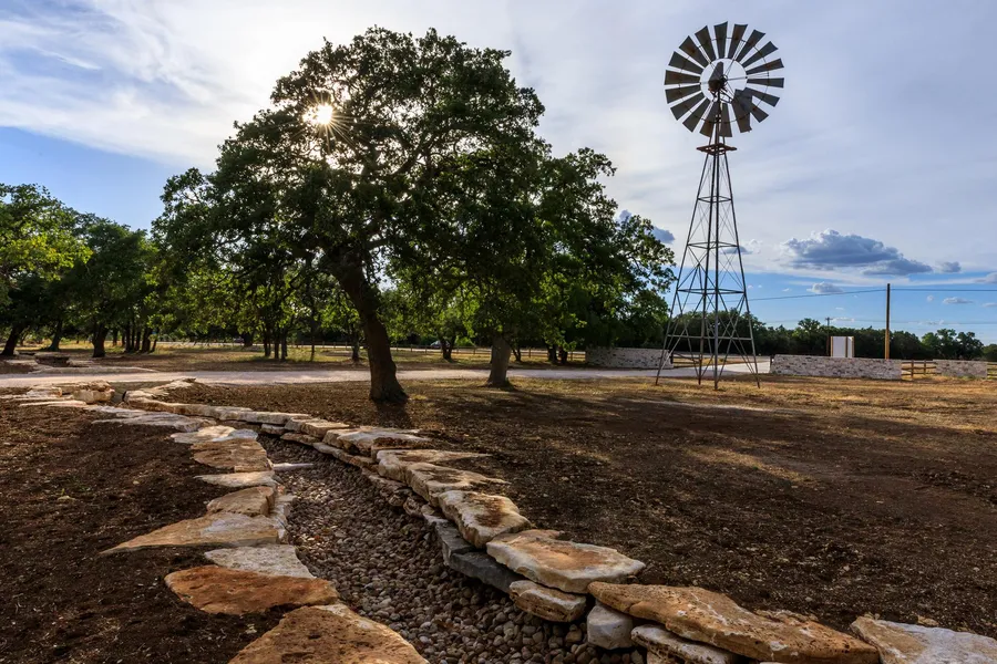 As you drive through the custom designed stone and iron entrance you'll find a brand new Timber & Stone building designed by Sam Burch in Austin, accompanied by a custom 450' long creek built with boulders hauled in from Florence and lined with plastic and fed by a 100 gpm well. The Timber & Stone building is approximately 832 soft with a large open room, kitchenette, and bathroom. About 750+ sqft of covered patio frame the reclaimed woods completing the high-end finish. Sit on the porch and enjoy looking over your creek and 52' tall, 16' wide windmill from West Texas! Not only can the over-sized septic system handle 5 more 800 soft retail buildings but the Seller will convey the Architectural and Site plans which show 3 different models of upscale casitas if someone would like to build a BnB Casita complex which is highly needed in this area of the Texas Hill Country wine corridor.