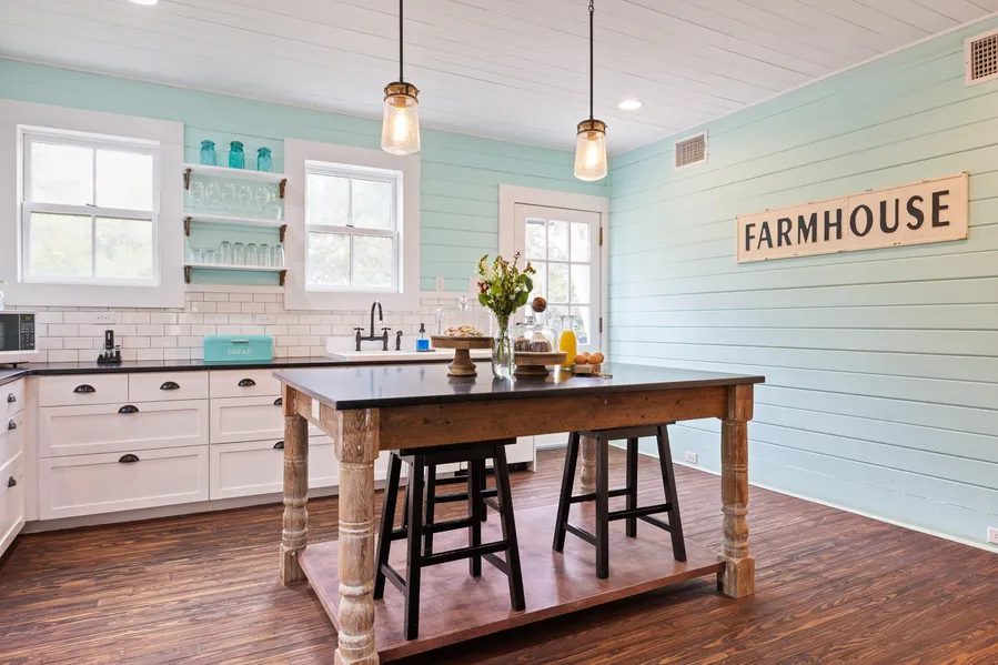 Home: Tucked away in a boutique vineyard surrounded by massive oak trees, the 1924 farmhouse bed-and-breakfast features five private en-suites that boast big Texas views of the surrounding wineries and hills. The spacious kitchen, dining room, and living area provide ample space for preparing a meal for a large group and enjoying a laid-back post-dinner conversation. There are multiple covered porches for shaded relaxation as well.