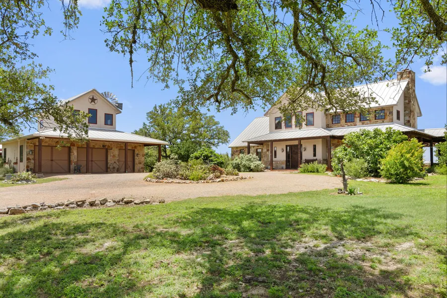 One of a kind 25 acre oak studded Hill Country Escape comprised of a luminous 2800+/- sf 2 bed, 2.5 bath Hill Country Craftsman Home accompanied by a spacious carriage house featuring a 2.5 bay garage with an inviting 1 bed 1 bath 500+/- casita and 40 x 45 workshop located minutes from the Blanco Square.