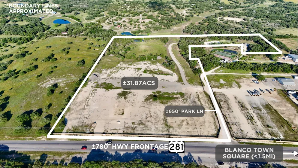 * The property is located within city limits of Blanco, TX under 1.5 miles north of the bustling town square. Direct road frontage makes the property accessible, visible, and versatile having 780' on US Hwy 281 North (2023 AADT count of 8,164) and another 650' on Park Ln. Access to other major markets includes Austin (45mi), San Antonio (50mi), Marble Falls (34mi), and Fredericksburg (35mi).
