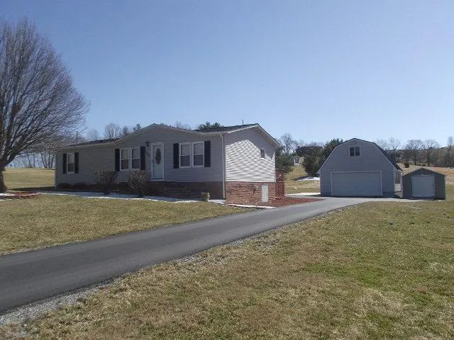 Doublewide home on just over a half acre and within approx. 2 mi. from I-77. Located not far from the National Forest and within 1 mi. of the school. This is a very clean home consisting of 3 bedrooms and 2 bathrooms. Interior features include newer appliances, some ceramic tile flooring and new laminate wood flooring. There is a 2 car detached garage that is 24'x24' with plenty of storage upstairs. New metal roof on garage installed in 2012. There is a propane heater already installed with 2 100lb. tanks located outside with the heat pump for an additional source of heat for the home. The garage is heated and cooled with a built-in unit. Paved driveway with road frontage right on Rt. 42(E. Blue Grass Trl.). More storage in the 12'x24' metal outbuilding. There is a large deck on the back of the house with newer paint. Property shows very well.