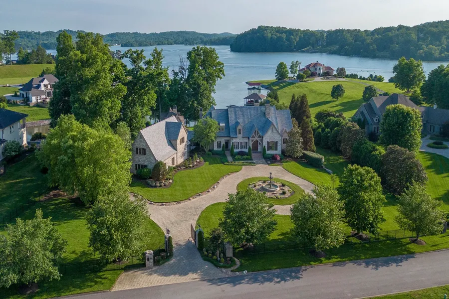 Welcome to this truly stunning waterfront home in Jackson Bend. Located on 3.4 acres overlooking Ft. Loudoun Lake, this 10,200 square foot French Country design home impresses from the moment you pull through the gate. Once inside the home you are welcomed into a 2 story foyer with beautiful water views through the formal living room's large windows. The formal dining room offers plenty of space to host dinner parties or family meals. Open to the informal dining area and family room, the large kitchen has Alderwood cabinets, granite counter tops, and a walk-in pantry. Throughout the main level the floors are Tigerwood hardwood, and the kitchen and family room have tongue and groove ceilings. A screened-in porch leads to an open air balcony, and both spaces are relaxing spots to have a cup of coffee or entertain with a wonderful view of the water. The luxurious primary suite is located on the main level and features separate his and hers closets, a large walk-in shower, and even more gorgeous water views. The wood-paneled office with fireplace is connected to both the primary suite and foyer. Two powder rooms, a laundry room, a smaller desk area, and a climate-controlled, 4 car garage with a bonus room above round out the main level. An additional 2 car garage is located on the lower level, which also features a game room, theater room, kitchenette, wine cellar, work-out room, full bathroom with steam shower, and an additional guest suite. Four additional bedroom suites and two bonus areas can be found on the home's second floor, and a massive walk-up attic is great for storage. Outside, a beautiful covered patio leads to the pool and hot tub. The guest house is just under 1500 square feet, and includes a full kitchen, fireplace, laundry room, and 2 full bathrooms. A arbor-covered patio near the boat dock is perfect for watching the sunrise or sunset. The home also has 2 geothermal heating systems, copper gutters, and an outdoor elevator.