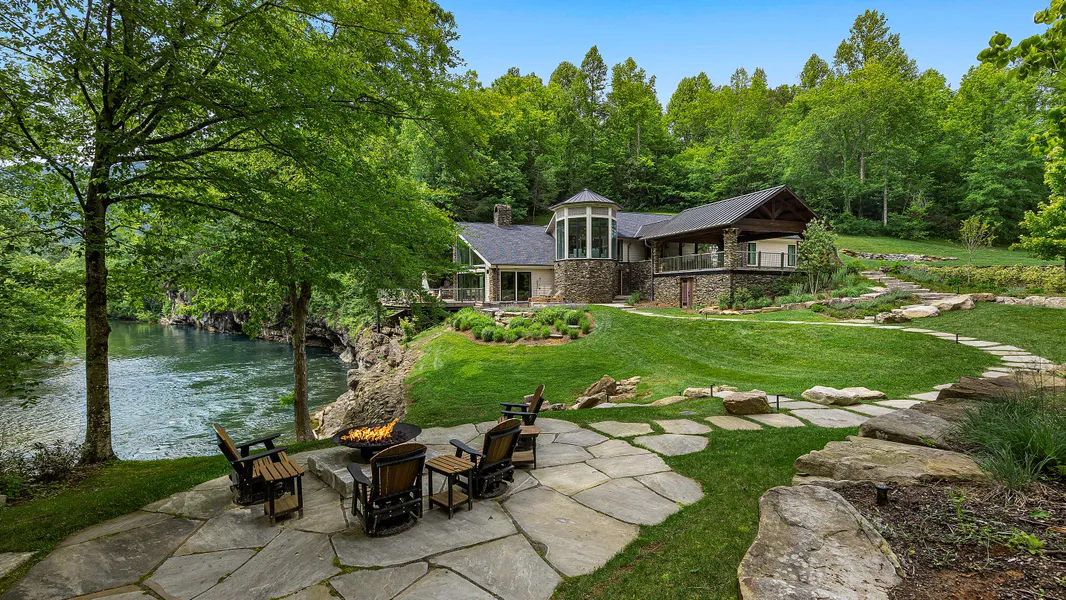 Nestled on 7 pristine acres with approximately 800 feet of the crystal-clear Little River, this extraordinary estate is a masterclass in refined mountain living. Located in the heart of Walland, in a park-like setting, and just minutes from the entrance to the Great Smoky Mountains National Park and a short drive to the world-renowned Blackberry Farm, this fully reimagined residence offers both seclusion and convenience in one of East Tennessee's most coveted settings. Completely renovated down to the studs, this bespoke home blends timeless craftsmanship with modern elegance. Every inch, from the wide-plank hardwood floors to the custom millwork and designer fixtures, has been thoughtfully curated to deliver a level of luxury rarely found in riverfront properties. The open concept living spaces showcase floor-to-ceiling windows that frame breathtaking water views, while a gourmet chef's kitchen, complete with top-tier appliances and artisan cabinetry, serves as the heart of the home. Multiple outdoor spaces—including a riverside terrace, a stone fire pit, and expansive decks—create the perfect setting for entertaining or quiet reflection. Adding depth and charm, you will find a rustic cabin with a cozy sitting porch and a gas fire pit overlooking the water—perfect for morning coffee or evening gatherings by the fire. A beautifully preserved smokehouse offering flexible use as a studio space or storage. The park-like setting features open lawns, mature trees, and curated landscaping that invites both play and peaceful reflection. And for the angler or nature lover, the fishing here is nothing short of exceptional, right from your own backyard. The main residence features three expansive bedroom suites, each with its own private en-suite bathroom, offering the feel of individual primary retreats. The walkout lower level is a true showpiece: two dramatic stacked stone, wood-burning fireplaces, back to back of each other and open for entertaining space. A centerpiece of the home lies in the lower level, where thoughtful design meets natural wonder. A striking exposed rock formation, naturally integrated into the space, anchors the custom bar—creating a one-of-a-kind gathering experience. A climate-controlled wine cellar completes the space, offering a luxurious nod to the home's rustic elegance. River Bend is more than an estate—it's a calming sanctuary.