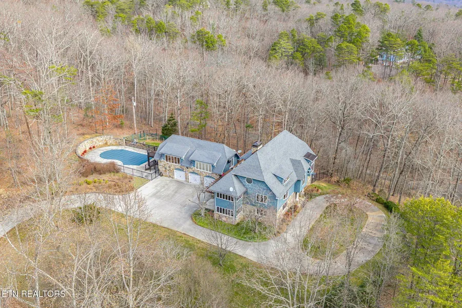 A Private Hilltop Estate of Rare Distinction Tucked away atop a secluded hill and enveloped by nearly seven acres of pristine woodland, this exceptional estate offers a lifestyle of privacy, refinement, and natural beauty at the Knox/Blount County line. With seasonal mountain and valley views and a long, winding approach through mature forest, the arrival experience alone feels like entering a private retreat. Every aspect of the property has been thoughtfully reimagined to support elegant living and effortless entertaining. The grounds unfold into a resort-caliber setting featuring a saltwater swimming pool, multiple outdoor gathering spaces, two fire pit areas, and a beautifully finished pool house with kitchenette, bath, and storage - ideal for hosting guests or enjoying peaceful evenings under the stars. Inside, the home blends timeless architecture with sophisticated upgrades. Iron French doors open to a gracious foyer and an inviting living room accented by hardwood floors, a wood-burning fireplace with gas starter, and a custom wet bar. A sunlit executive office with granite surfaces and bespoke built-ins offers a refined work-from-home experience. The residence is thoughtfully designed for comfort and privacy, with three en-suite bedrooms on the lower level, a spacious laundry room with extensive storage, and the rare convenience of both a laundry chute and dumbwaiter serving all levels. The upper level reveals a dramatic great room crowned by soaring cathedral ceilings, skylights, custom built-ins, and a second fireplace, flowing seamlessly into a dining space framed by views of the surrounding landscape. A newly designed staircase with iron spindles anchors the architecture, while the loft above offers a sophisticated library and sitting area with access to a walk-in attic enhanced by new foam insulation and approximately 1,000 square feet of functional storage. At the heart of the home, the gourmet kitchen is both beautiful and highly functional - featuring vaulted ceilings, new double convection ovens, abundant custom cabinetry, granite countertops and backsplash, designer undermount lighting, and a sunlit breakfast room overlooking the grounds. The owner's suite is a true sanctuary, offering private deck access, a sitting area, an exceptional walk-in closet, heated tile flooring, and a spa-inspired bath with jetted soaking tub, seasonal mountain views, dual vanities, and an oversized walk-in shower with dual shower heads. An entertainer's dream, the expansive 1,100+ square foot recreation room above the garage is outfitted with a wet bar, kegerator, wine refrigerator, and a private balcony overlooking the pool and grounds - perfectly suited for game days, private events, or evening gatherings. The estate is further enhanced by an oversized three-car garage with custom cabinetry, circle drive, ample parking, multiple fruit trees, newer pergola, and a comprehensive list of recent upgrades including geothermal heat pumps, Pella windows, hardwood flooring, crown molding, lighting, powder room, dry bar, Ecobee thermostats, and a professionally installed RainScapes irrigation system. Washer, dryer, and refrigerator convey. This is not simply a home - it is a private legacy property offering enduring craftsmanship, elevated design, and a lifestyle rarely available in today's market.