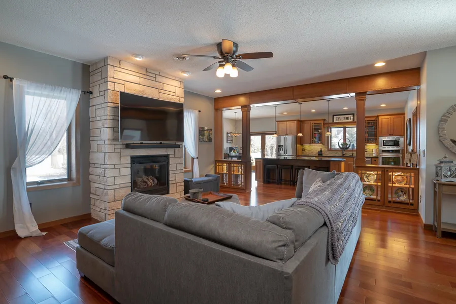 This spacious 5,600 + square foot, 5 bedroom rambler located on the edge of West Mankato is a must see. Stepping into this house you will immediately notice the beautiful Brazilian hardwood floors that run throughout the main floor along with the eye catching travertine tile that finishes the fireplace. This home gives you the open concept youre looking for with the luxury of heated floors throughout the whole house. The kitchen presents all stainless steel appliances with sparkling granite countertops and a tremendous eleven foot center island. Walking through the kitchen and into the relaxing sunroom you have access to the outdoor patio that stores the jacuzzi hot tub. Main floor laundry is another great perk with great built in storage and tiled floors. There are three bedrooms on the main floor. The master bedroom gives you access to the patio, a jacuzzi tub/shower and a large walk-in closet. The upgrades are endless in this home and continue into the basement. Two more sizable bedrooms, bath, game room area and a jaw dropping movie theater with 12 leather theater seats for all your guests. In the back yard, you have an ideal space for outdoor entertainment with a BBQ grill island on more stamped concrete that leads to the fire pit area. A 14 x 20 storage shed completes this desired location on one acre. Call today for your very own private tour!