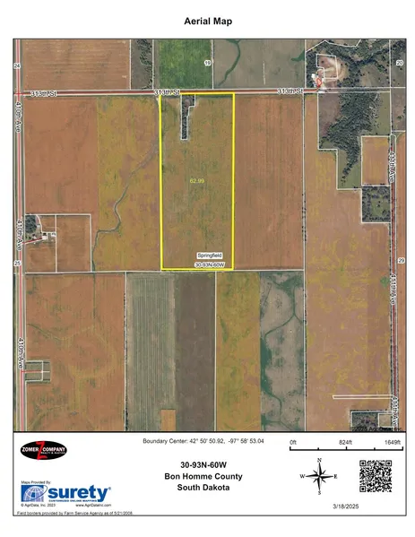 General Description: According to the Bon Homme County Assessor this property consists of approx. 62.99+/- gross acres. According to Agri-Data this farm contains approx. 62.8 tillable acres. This farm according to Agri Data has the following predominant soil types: HrA-Homme-Onita, HmA-Homme-Davison-Tetonka, HrB-Homme-Onita, EmE-Betts-Ethan. This farm according to Agri-Data has a soil productivity rating of 86. This is a great opportunity to purchase a nice tract of farmland in Bon Homme County, SD! It is not often that you have the opportunity to purchase land in this area! Do not pass up the opportunity to purchase this quality tract of Springfield TWP land!