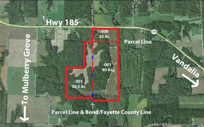 151 Acres +/- Recreational Farm with Tillable Acreage. Approximately 55 Acres Tillable. This property is situated on the Bond / Fayette County Line in Southwestern Illinois, approximately 60 miles northeast of the St. Louis Metropolitan Area. Land is located 8 miles north of Mulberry Grove and 8 miles west of Vandalia, IL on Highway 185. Great Deer & Turkey Hunting! Ground is level with some gently rolling and partially wooded. Zone Agriculture. Property Viewing: Saturday, April 19 12 - 2 pm. Auction Held at: American Farm Heritage Museum, 1395 Mueseum Ave., Greenville, IL 62246. See marketing flyer for complete property information.