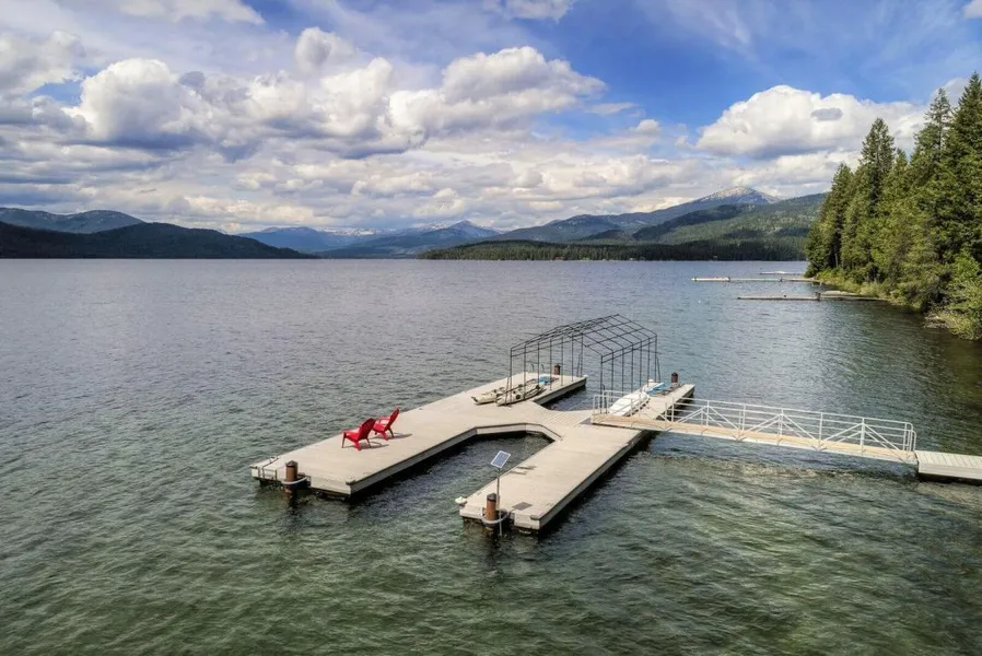 Make your Priest Lake dreams come true with the ultimate in waterfront cabin luxury at the prestigious Huckleberry South Shores community. This year-round architectural masterpiece boasts 145' of private sandy beach with terraced lake view patios to maximize the stunning views.Impressive timber frame construction with board and batten exterior. This two-story woodland retreat is flanked by two separate outdoor decks, engineered with an attractive curved and cabled see-through railing. Jigsaw flagstone pavers surround the estate with multi-functional plazas featuring a large fire-pit, sunning area and beach access. Professional landscaping and boulder placement create an exceptional connection from the cabin to the waterfront.