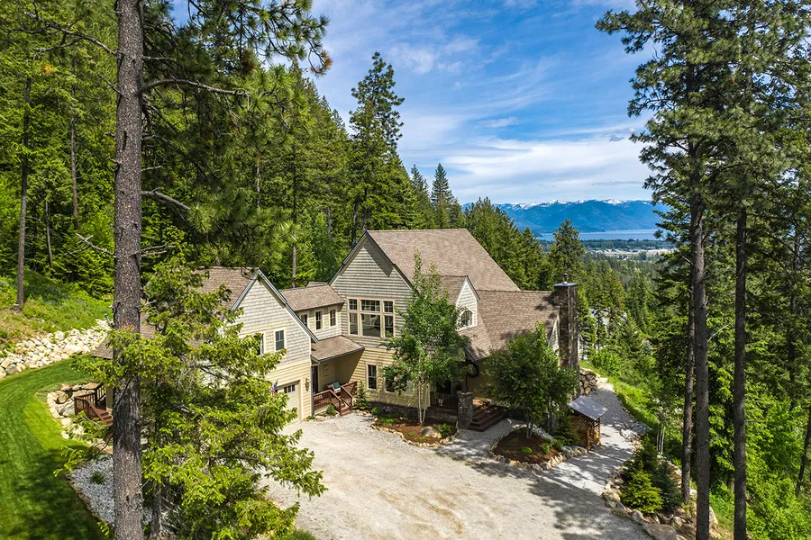 Torn between slopes or shoreline? Enjoy the perfect balance with this private oasis nestled on the hillside between the Schweitzer shuttle and City Beach! Stunning views just 3 miles from town complement the main home that features en suite bathrooms for each of the 4 bedrooms. An attached apartment with private entry has a full kitchen, washer/dryer, bedroom, loft and full bath. The open-concept floor plan includes a two-sided stone fireplace, amazing chef's kitchen with walnut-topped island, Thermador appliances and walk-in pantry. After entertaining, retreat to the spacious bedroom suite and luxurious, spa-like bath with steam shower. The separate-entry office with wood-burning stove easily facilitates work from home. Inside spaces transition to covered porches, patio with fire pit, easy-care landscaping & lush lawn with sprinklers.