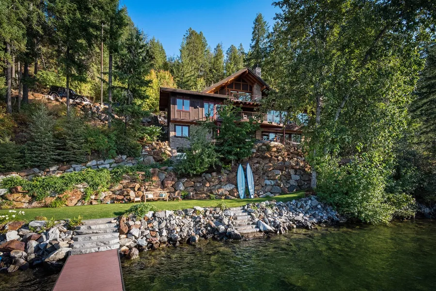 First time ever offered! Contemporary home with 160' of private waterfront on Lake Pend Oreille. There's room for the whole gang in this stunning 5000 +/- square foot 5 bed 6 bath residence boasting a theater room, large den/game room with wet bar, 4 fireplaces, main floor outdoor dining area, lower level patio with sunken hot tub, upper level studio with private balconies, and water views from almost every room in the house. Outside a grass covered pathway leads you down to the lawn at the waters edge where youll find an incredible dock system with a diving board and room for all the toys, plus granite stone steps into the pristine crystal clear waters of the lake. High end finishes throughout including a gourmet kitchen with stainless appliances, and extensive use of granite, stone, wood and tile inside and out. Central Vacuum & A/C, and high-speed Internet. All this & more only minutes from downtown Sandpoint, Schweitzer Ski Resort and all North Idaho has to offer!