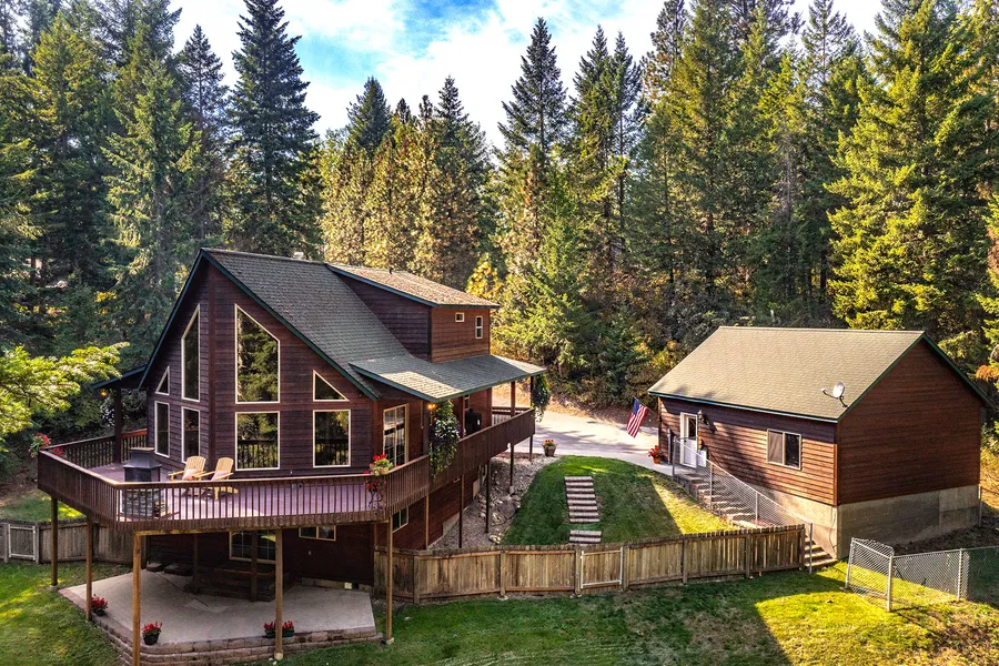 Complete privacy and easy access are yours in this gorgeous cedar-sided beauty less than 5 miles to Sandpoint. Chef's kitchen boasts Hickory cabinets, granite counters and all new flooring throughout the open floor plan, updated in 2016. Soaring ceilings and prow windows allow views of the wildlife in the treetops. Each level includes a spacious bedroom and a bath to serve it. Private master suite on the upper level includes a large closet and roomy bath with walk-in shower. Cozy up to the natural gas fireplace in the living room, and there's a fireplace on the wrap-around deck for four-season outdoor living. Fully fenced back yard protects the abundant garden with perennial plantings and lush lawn and is perfect for pets. The large 1.32 acre lot has room for a shop near the oversized 2-car garage with storage above. You'll find this home move-in ready and impeccably maintained, tucked away with no neighbors in sight, so close to the Lake, Sandpoint and Schweitzer Mountain Resort.