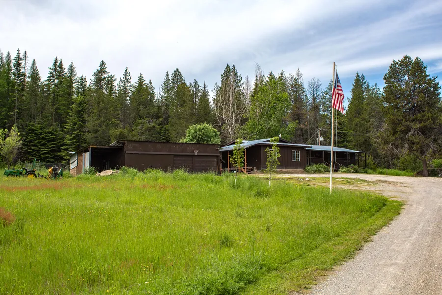 Home on 9.95+/- acres with 5 bedrooms, 2 baths with everything you need on the main level. Great size living room, that over looks the covered front porch, with filtered views of the mountains to the north(take out some trees for a better view). Cozy wood stove that you can use to heat the home in the dining room that opens to the kitchen. There is a a sitting room off the living room, along with three bedrooms with one being the master suite with a private bath. There are two additional bedrooms close to the office/mud room on the other side of the home. There is detached three car garage, garden area and plenty of room for animals if you open the property by removing some of the trees, no CCR's. Sellers used POVN for Internet. Partial unfinished basement used for storage. Close to Sandpoint