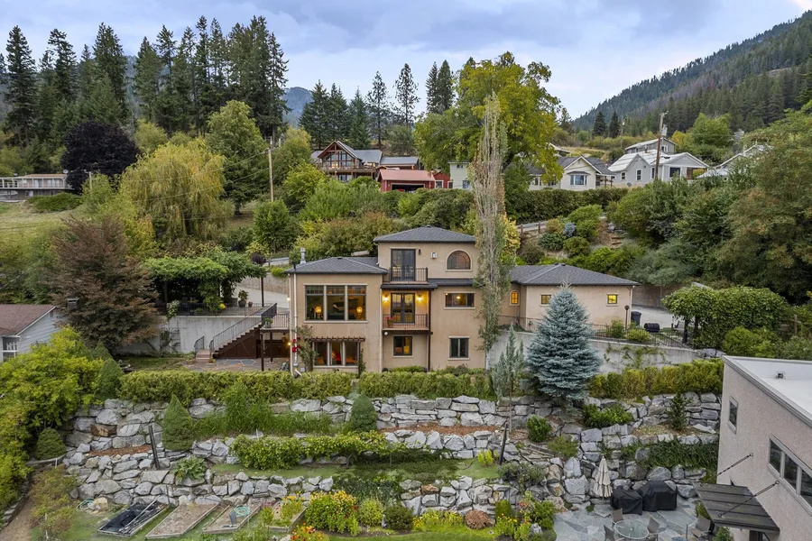 SCENIC LAKE VIEW HOME IN HOPE WITH MODERN MEDITERRANEAN STYLE & OLD WORLD CHARM! 2608 SF, 3 Bed/3 Bath Home on a private, lushly landscaped lot, with spectacular views looking out across Lake Pend Oreille to the Hope Peninsula and the Green Monarchs. Superb craftsmanship and quality materials throughout the home start with an arched solid wood front door leading into the main level with high ceilings, huge picture windows and artfully stained concrete floors with hydronic heating. An open floor plan encompasses a living room with slate gas fireplace, formal dining, den/office, full bath, laundry room and gourmet kitchen with custom cabinetry, granite counters & top end appliances including a Wolf range. A hand-hewn solid wood staircase with custom hand-wrought iron railing leads up to the luxurious master suite with solid wood floors, 3-sided fireplace & balcony overlooking the garden. The master bath features a walk in closet, intricately tiled double shower & a deep soaking tub with the best window in the house looking down the big lake. The lower level has 2 additional bedrooms, full bath, cozy family room & French doors leading out to the backyard with slate patio & Mediterranean style fountain. Landscaping designed beauty, low maintenance & privacy includes mature trees, native shrubs, lavender, iris, trumpet & grape vines. Friends & neighbors call the special outdoor dining area “the Best Room in Hope,” covered by a pergola with wisteria & climbing hydrangea with a natural stone, wood-burning fireplace. On a maintained road, the paved driveway leads to a 2-Car Garage & plenty of parking. Only 20 minutes to Sandpoint, and close to the public boat launch in Hope, golfing at the Idaho Club & skiing at Schweitzer Mountain. Home on adjoining property @ 519 Aspen Ln of similar architectural style is also for sale and could make a perfect guest house!