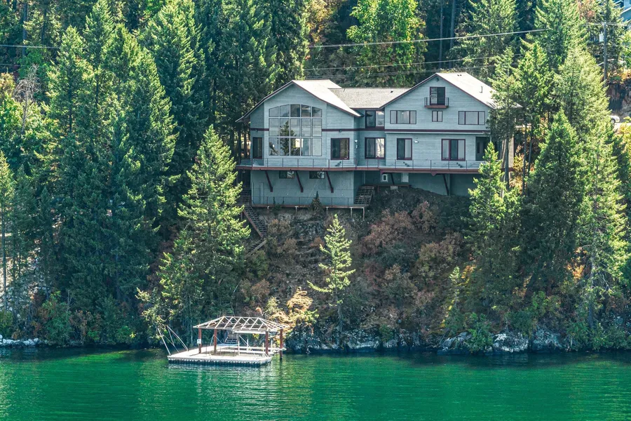 Beautiful custom waterfront perched above Lake Pend Oreille boasting over 200' of crystal clear lakefront with unobstructed views across the lake to Sandpoint, Schweitzer Ski Resort and beyond. There's room for the whole gang in this 6 bedroom 5 bath well appointed home with lake views from nearly every room. The large primary bedroom has an attached exercise room/office and access to the back deck, as well as a generous bath featuring a dual vanities, a soaking tub and separate shower, and dual walk in closets. The living room features wood floors, soaring ceilings, and a wall of windows to capture the lake views. Kitchen has granite counters and a wet bar plus a large pantry. Outside there's a private dock and covered boat lift, and decks to enjoy the view. Privacy and convenience only minutes from downtown Sandpoint.