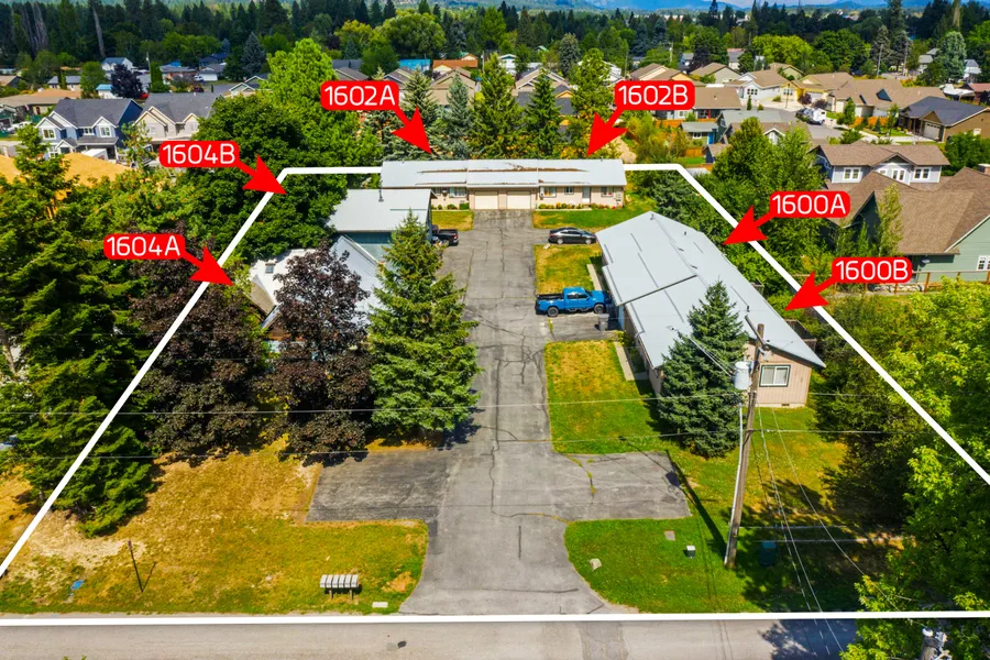 Fantastic opportunity to own three duplexes (3 separate buildings); a total of six rental units on three separate lots in downtown Sandpoint. Building 1600 is 3 bedrooms, 2 bathrooms, 1071 sq ft per unit. Building 1602 is 2 bedrooms, 2 bathrooms, 946 sq ft per unit. Building 1604 is the original house of 3 bedrooms, 2 bathrooms, 1584 sq ft and apartment; 2 bedrooms, 2 bathrooms, 900 sq ft. Each unit has a private attached 1-car garage. There is also a private owner’s (landlord) garage and utility/workshop area. For a total of 15 bedrooms, 12 bathrooms, 7 garage bays, 6518 sq ft, .85 acres. Prime location in downtown Sandpoint, right behind the library with a nicely paved driveway and extra parking spaces for guests and tenants. Excellent rental history, low maintenance units, apartment (1604B) has been recently remodeled. Close to the library, schools, shopping, parks, trails and downtow...
