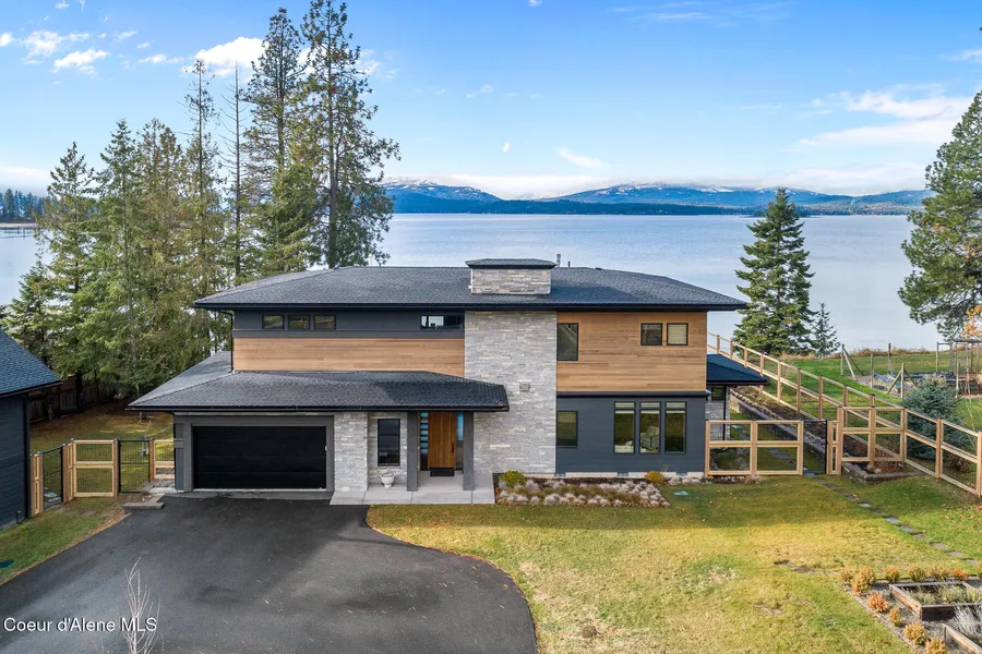 Welcome to the Hope Peninsula, a waterfront haven on the shores of Lake Pend Oreille. This exquisite, newer custom-built home boasts over 110 feet of lake frontage, offering breathtaking 180-degree views of Memaloose, Cottage, and Pearl Islands, with the iconic Schweitzer Mountain Resort painting the backdrop to the west—perfect for enjoying stunning sunsets. Every detail of this modern masterpiece has been thoughtfully crafted, both inside and out. Step inside and be greeted by a wall of windows that frame the lake and flood the home with natural light, complemented by warm wood accents throughout. The layering of natural materials creates a sense of serenity and sophistication in every corner of the home. The formal living area, featuring two fireplaces, offers the flexibility to include a formal dining space if desired. The gourmet kitchen is a chef's dream, complete with a lake-view breakfast bar, high-end appliances, and a hidden pantry. A cozy media room with a fireplace and surround sound makes for the ultimate entertainment space. Upstairs, the bedroom suites are truly extraordinary, each designed with comfort and luxury in mind. Outside, the 3/4-acre property is fully fenced with a gated entry, ensuring privacy and tranquility. Enjoy the large patio with a covered BBQ area, ideal for gatherings, or take advantage of the private dock and boat lift for endless lake adventures. The property also features a spacious 34' X 34' shop with an attached 900 sq. ft. one-bedroom ADU, perfect for guests or additional living space with great lake views. With a garden area, unparalleled views, and meticulous design, this home is a rare opportunity to experience waterfront living at its finest.